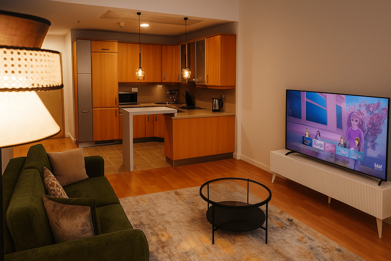 В апартаментах — просторная студия с мягким диваном-кроватью, обеденной зоной и большой Smart TV с Netflix. Интерьер сочетает натуральное дерево, свет и текстиль в природных тонах. Отдельная спальня оформлена в успокаивающем сине-белом стиле, с комфортабельной кроватью и дизайнерским изголовьем.